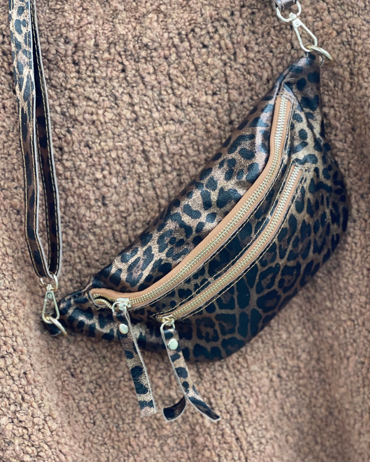 Sac banane en cuir irisé, avec poches. Se porte en bandoulière épaule également, hyper tendance avec cette imprimé léopard irisé, trop fun!!!!