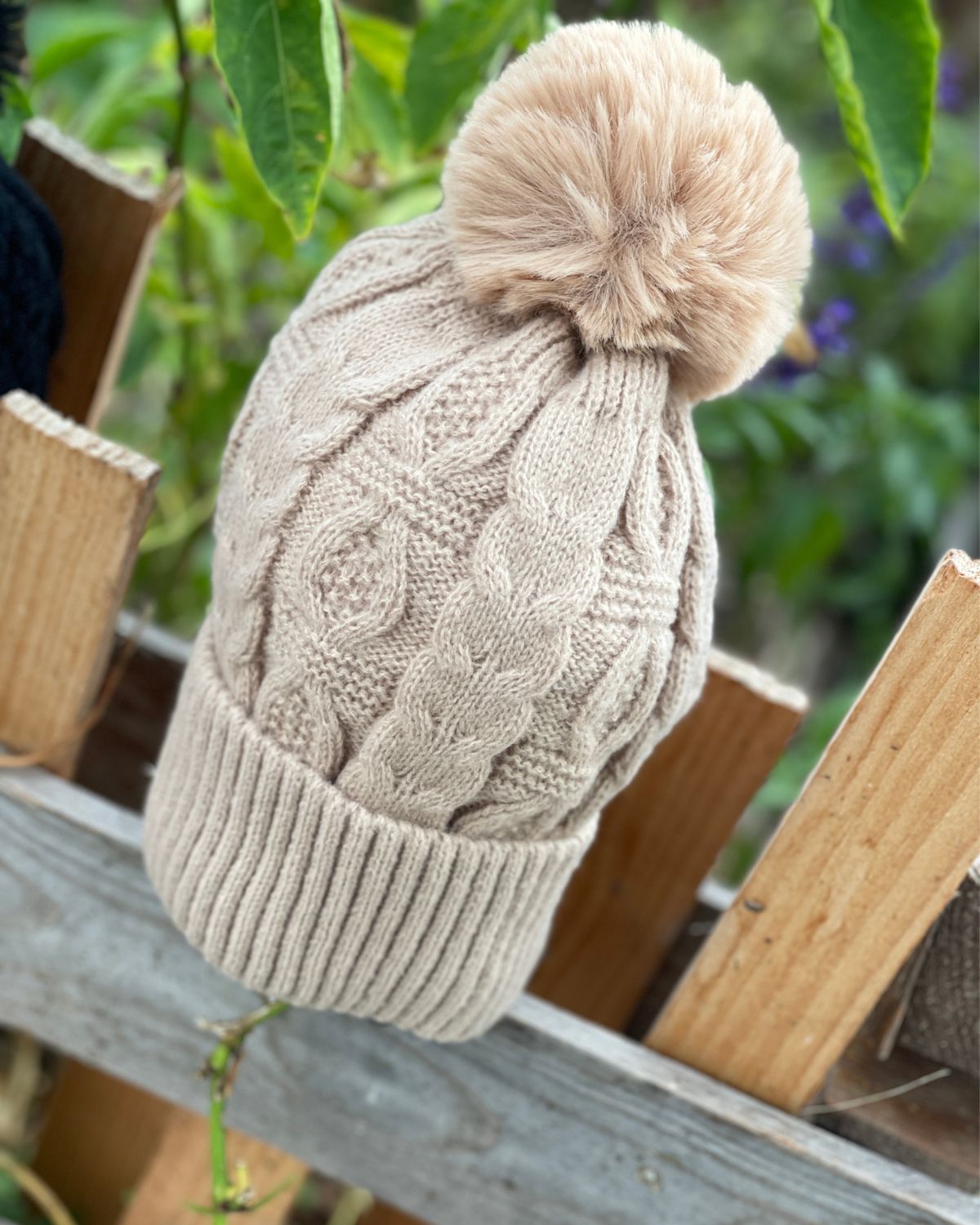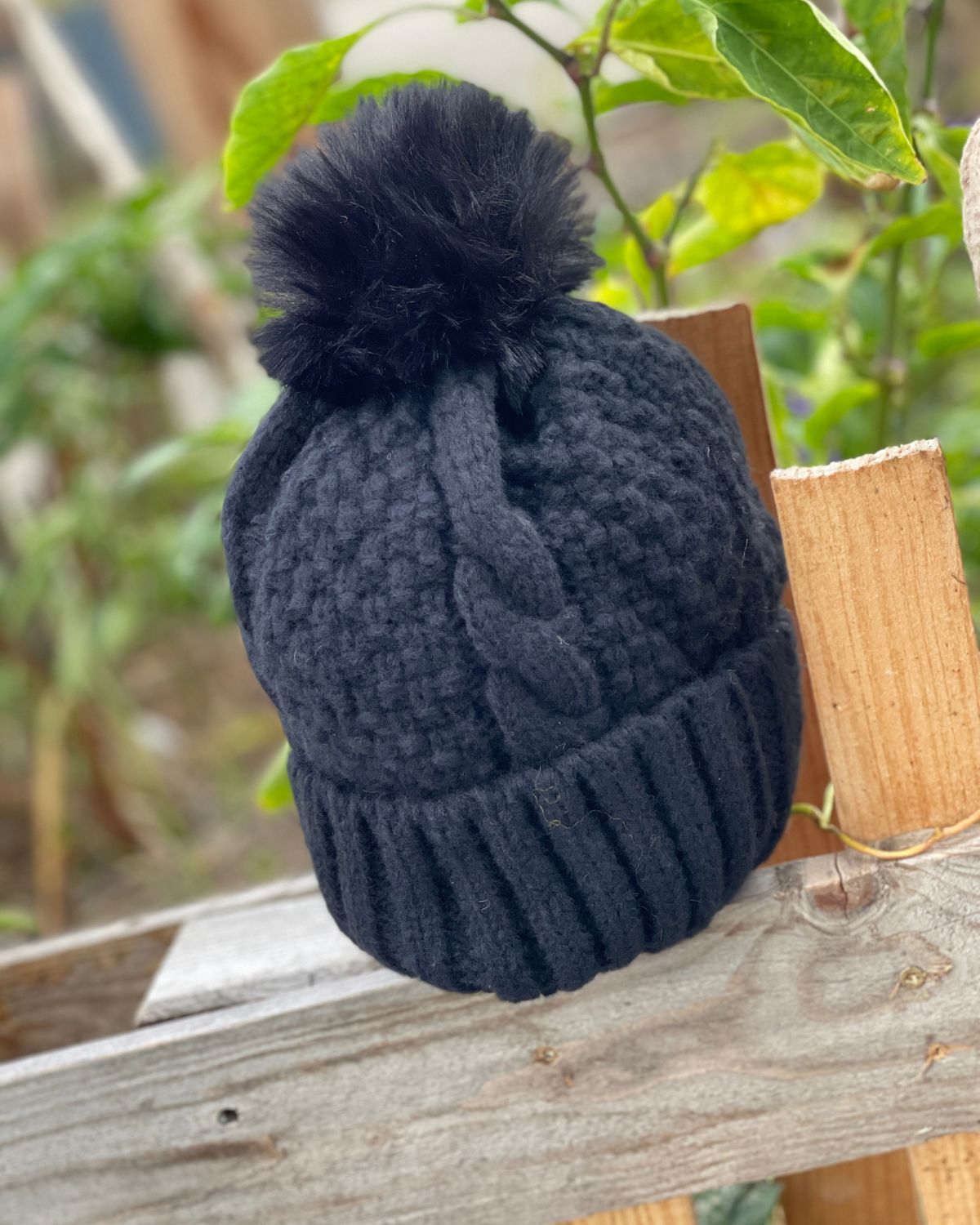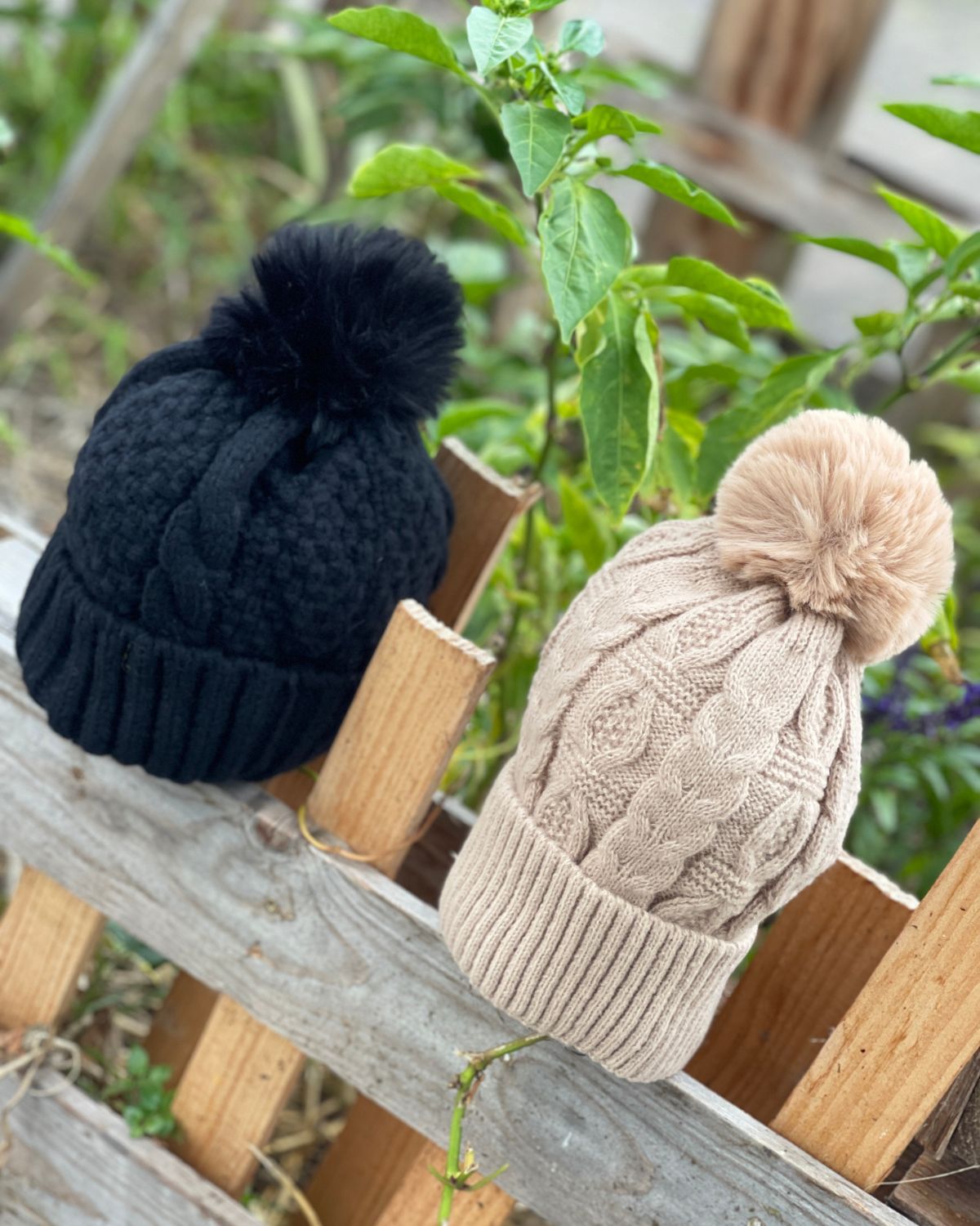 Super bonnet avec pompom, matiรจre lรฉgรจrement trรฉssรฉ pour l’effet mode, doublรฉ polaire ร  l’intรฉrieur pour le froid de l’hiver… On adore!!!