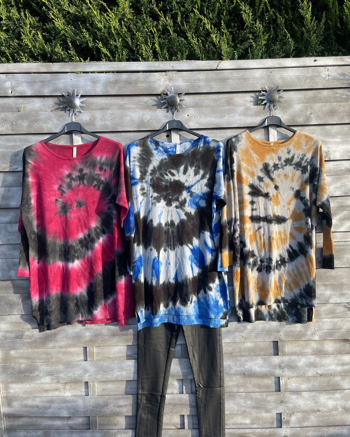 Trop sympa ces pulls tie and dye… On les portes volontiers avec un leggings en simili ou un jean bien skinny ou slim… Originaux, chauds, on adore le motif et les couleurs…
